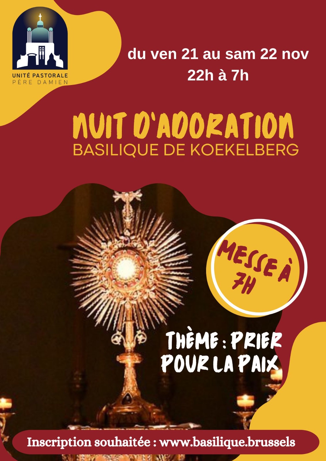 Dans le cadre du Festival Venite Adoremus, l’Unité Pastorale Père Damien a vécu, du vendredi 21/11, 22h au samedi 22/11, 7h, une grande nuit d’adoration eucharistique, entièrement offerte pour la paix dans le monde et dans nos vies.