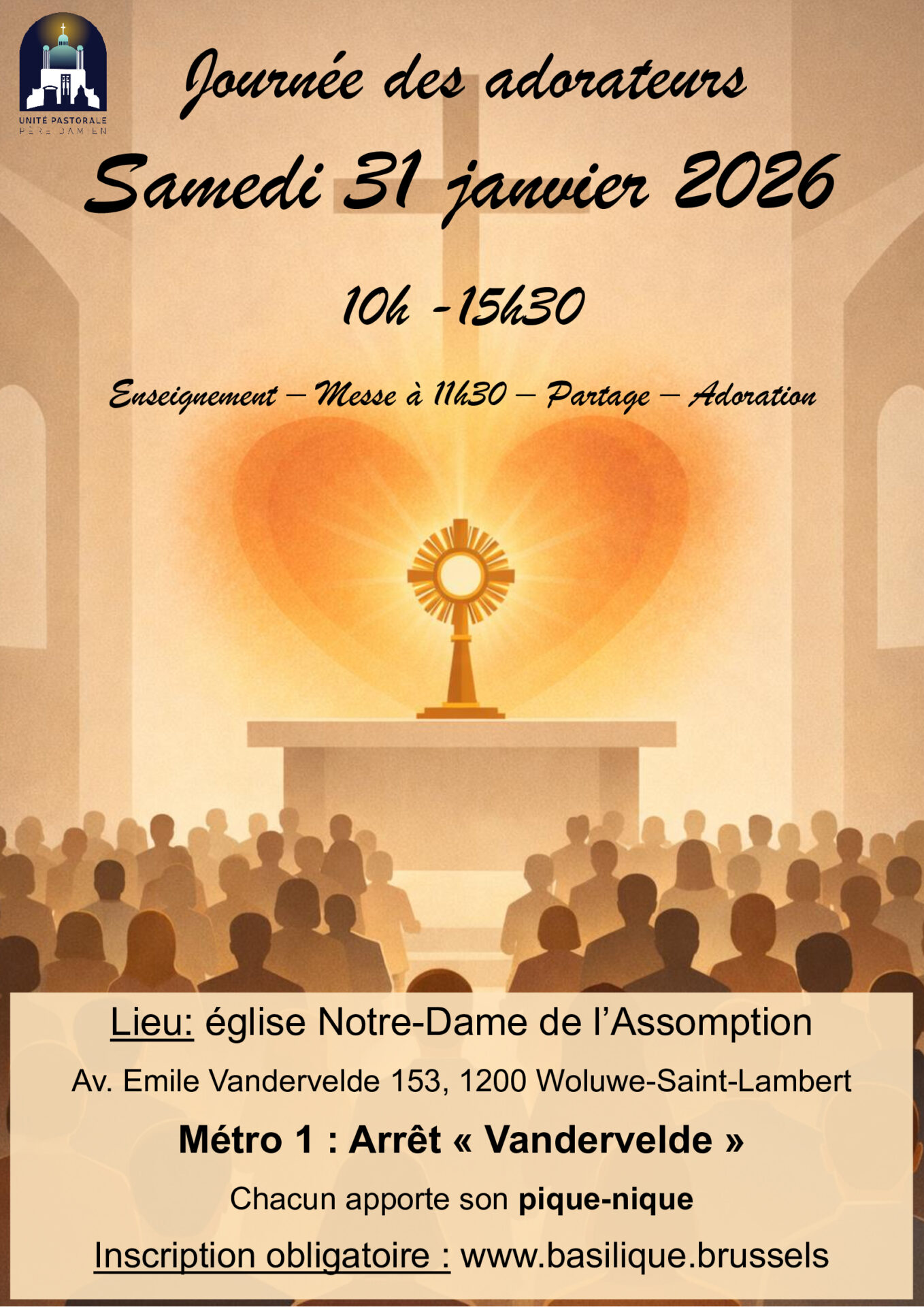 Tous les adorateurs de l’Unité Pastorale Père Damien et d’Unité et de la paroisse Notre-Dame de l’Assomption sont invités à se retrouver pour une Journée des adorateurs, le samedi 31 janvier, à l’église Notre-Dame de l’Assomption à Woluwe-Saint-Lambert.